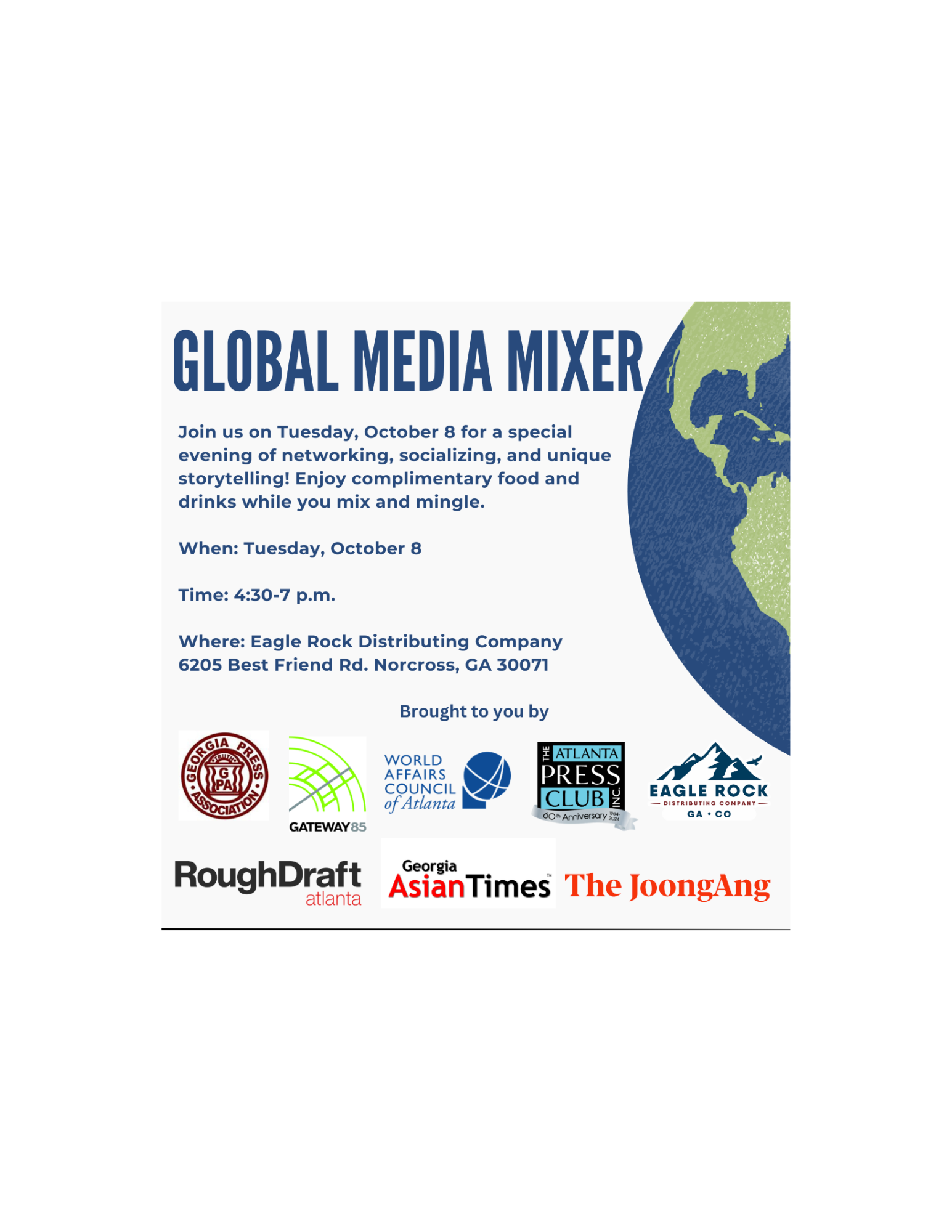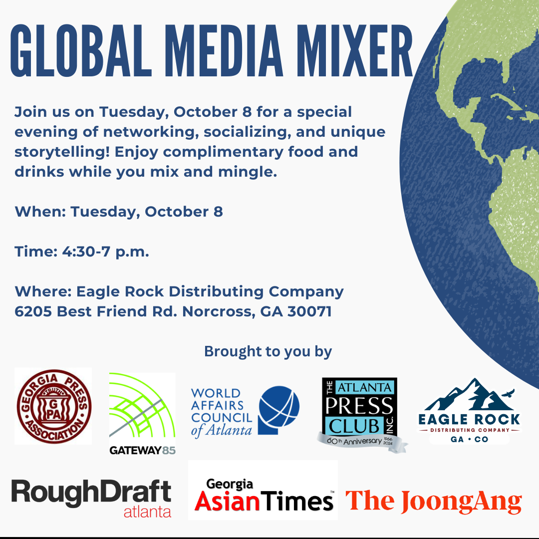 The Atlanta Press Club has teamed up withGateway85 CID, Georgia Press Association and World Affairs Council of Atlanta to host the second annual International Media Mixer, an event dedicated to fostering connections within the local and global media community and beyond. We hope to see you there!