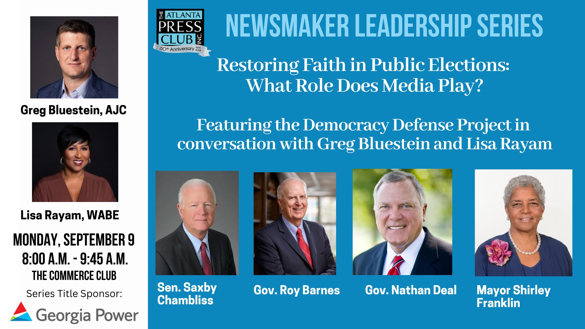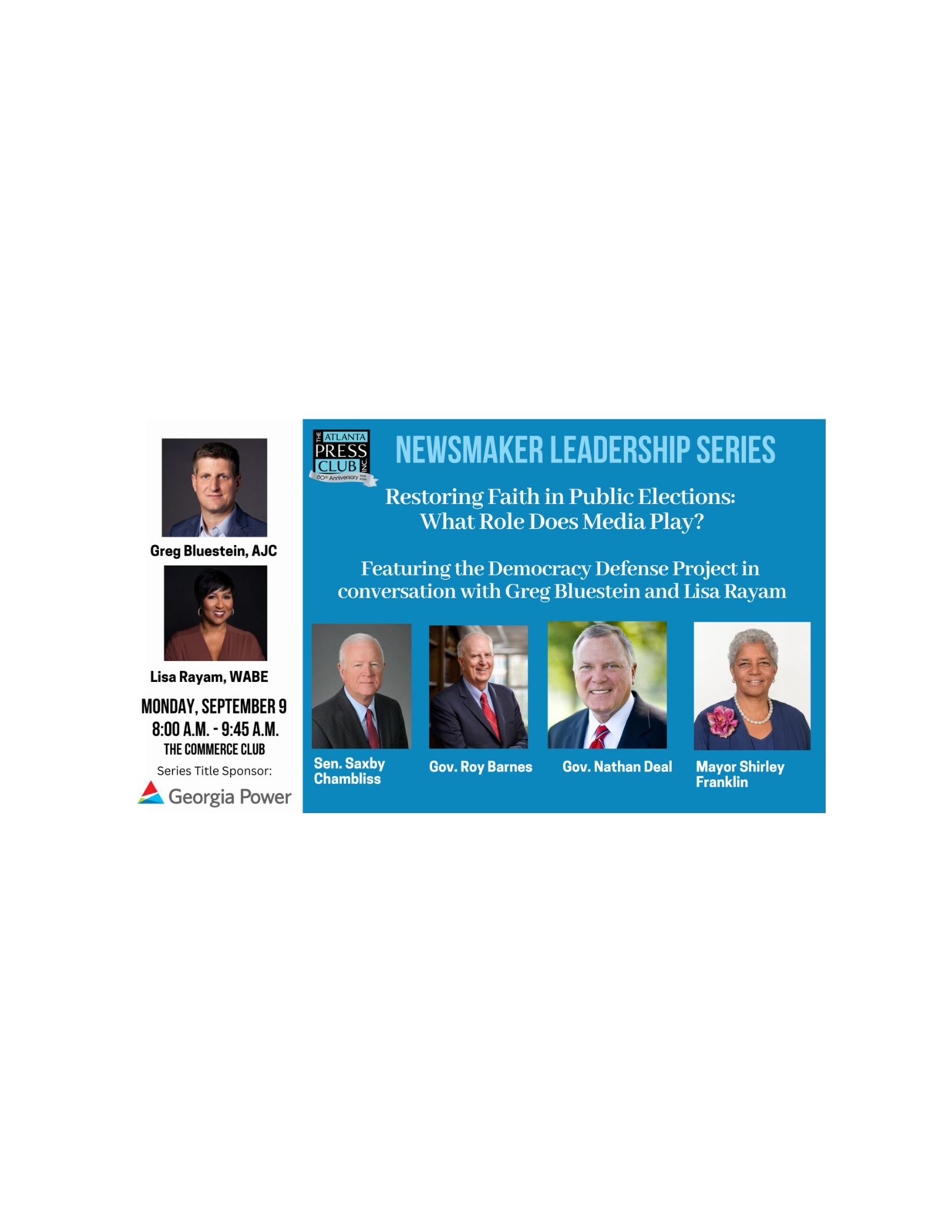 Click below to watch the recording of the program! Join us on Monday, September 9, for breakfast and a discussion on “Restoring Faith in Public Elections: What Role Does Media Play?”. Greg Bluestein, AJC, and Lisa Rayam, WABE, will co-moderate this event, which will feature the bipartisan leadership team from the Georgia Democracy Defense Project, including Sen. Saxby Chambliss, Gov. Roy Barnes, Gov. Nathan Deal, and Mayor Shirley Franklin.