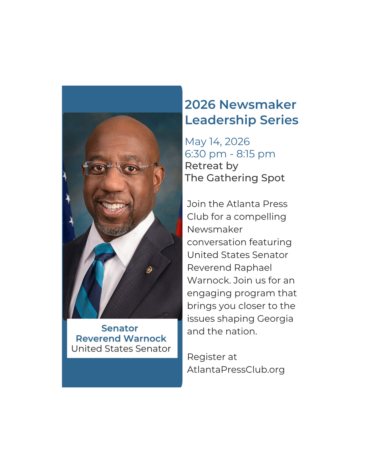 Senator Reverend Raphael Warnock joins the Atlanta Press Club for a special Newsmaker conversation on the issues shaping Georgia and the nation. From policy priorities in Washington to the challenges and opportunities facing Georgians at home, this timely discussion will offer insights from one of the state’s leading voices in public service and national politics. We hope you will join us!