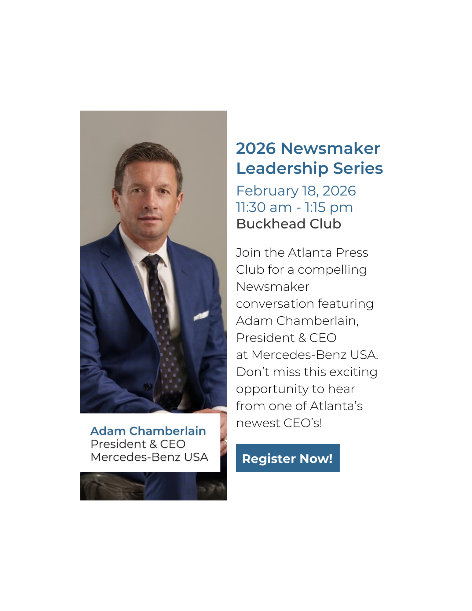 Join The Atlanta Press Club for a Newsmaker Leadership Series luncheon featuring Adam Chamberlain, President and CEO of Mercedes-Benz USA. Adam will share insights on leadership, economic trends, and why Atlanta continues to play a pivotal role in Mercedes-Benz’s North American operations. Crystal Edmundson, Atlanta Business Chronicle, will moderate the conversation.