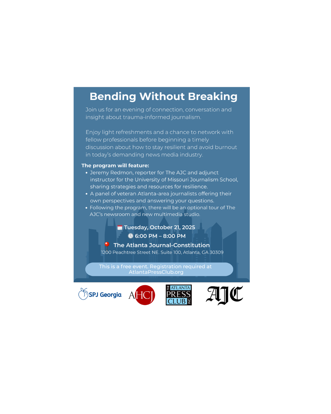 - Jeremy Redmon, reporter for The Atlanta Journal-Constitution and adjunct instructor for the University of Missouri Journalism School, sharing strategies and resources for resilience.