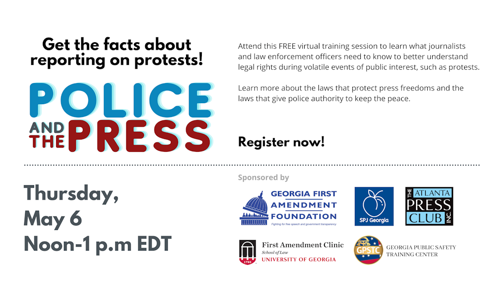 Attend a free virtual training session on what journalists and law enforcement officers need to know to better understand and respect one another’s roles during volatile events of public interest, such as protests. Delve into the details on laws that protect press freedoms and give police authority to keep the peace. Learn about a new media-police training course developed by the Society of Professional Journalists Georgia Chapter in conjunction with the Georgia Public Safety Training Center (GPSTC).