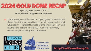 Unpack the 2024 legislative session with political journalists and a First Amendment expert, who will decode major bills impacting government transparency, First Amendment rights and public policy. This virtual event will be hosted by the Atlanta Press Club and the Georgia First Amendment Foundation on April 16, 2024, from Noon to 1:00 p.m. Moderated by Rahul Bali, WABE. Featuring panelists Nora Benavidez, Legislative Committee Co-Chair, Georgia First Amendment Foundation & Senior Counsel, Free Press and Maya Prabhu, Government reporter, The Atlanta Journal-Constitution.